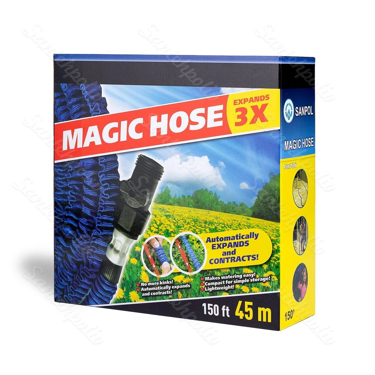 Гнучкий шланг довжиною 150 футів (45 метрів) з 7-функціональним пістолетом-розпилювачем (1 шт.), швидкознімним конектором (2 шт.) та перехідним адаптером діаметром ½-¾ дюйма (1 шт.) Артикул: UKR-054 Діаметр, мм: 1/2"; 3/4" Матеріал: Пластик Тип: Шланг